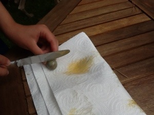 Am Freitag war nach 17 Bruttagen das Nest plötzlich verlassen und die 4 blieben zurück. Wir gingen davon aus, dass es zu heiß war mit der Nachmittagssonne, die auf die Hauswand schien oder das Vogelpaar sich doch gestört fühlte. Also beobachteten wir noch einen Tag das Nest, um zu erkennen , dass es kein Zurück mehr gab. Die Eier sahen auch schon Grün Braun aus. Nach einem weiteren Tag heute entfernte ich das Vogelnest, da verlassene Amselnester nicht mehr bezogen werden und im nächsten Jahr nur den Platz für einen Neubau blockieren. Die Neugier siegte dann und mein Sohn und ich mussten erforschen, was passiert war. So öffneten wir vorsichtig das erste Ei, in der Erwartung ein abgestorbenes Küken oder ein verfaultes Ei zu sehen.