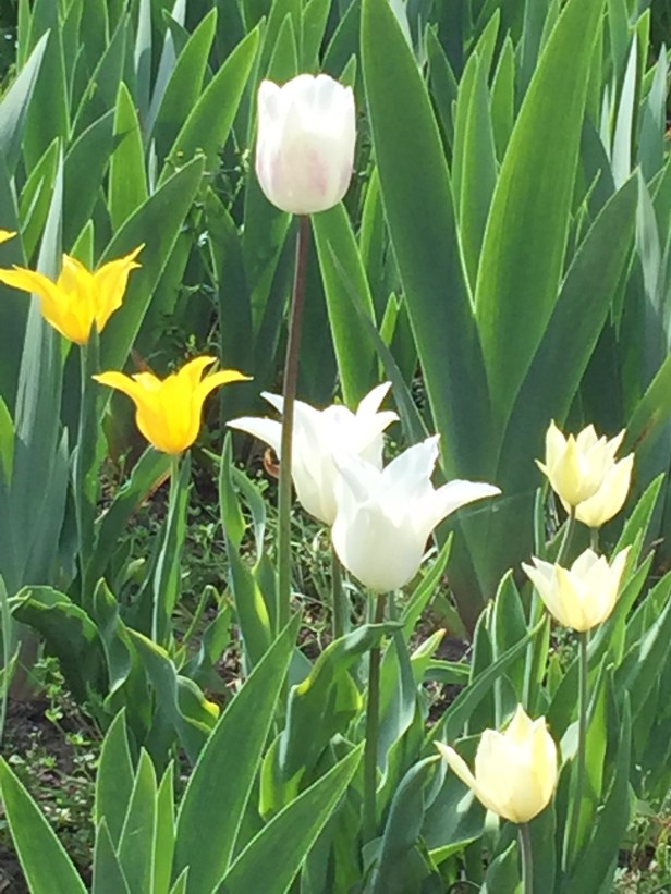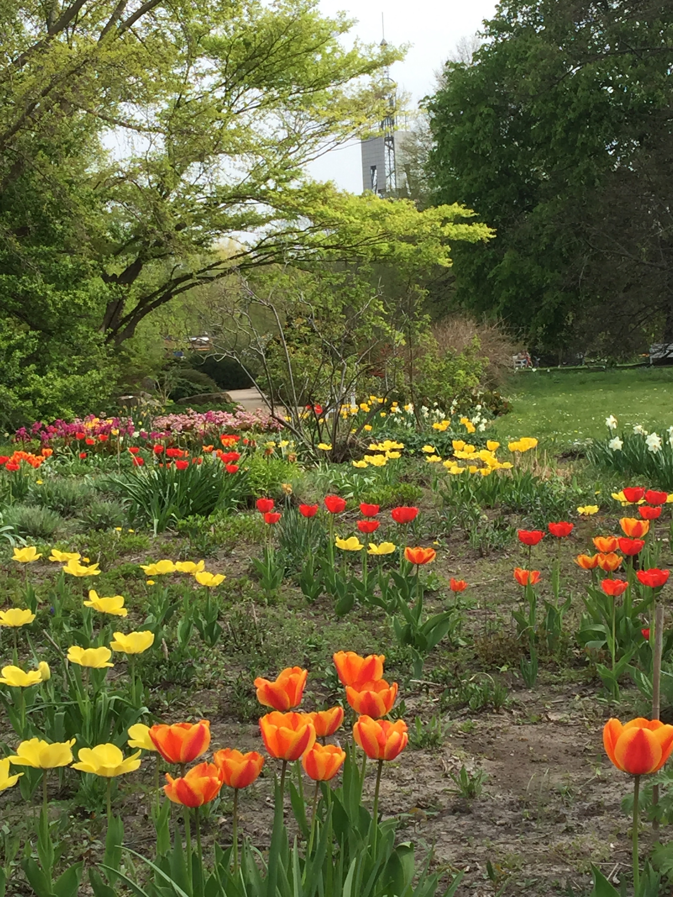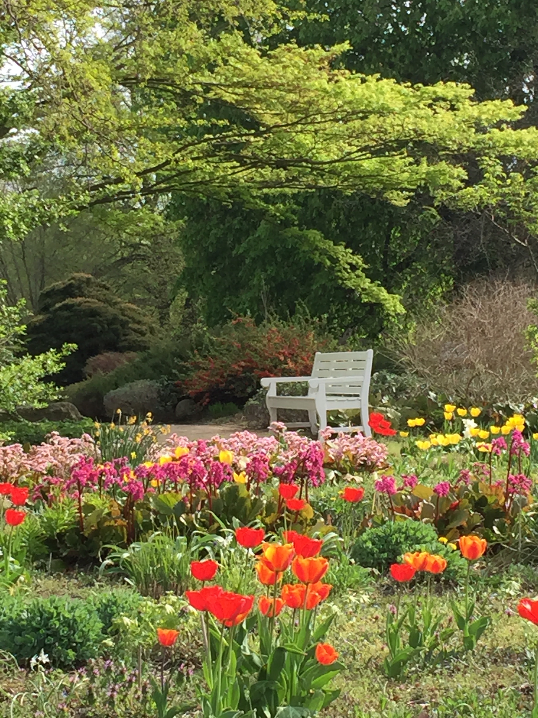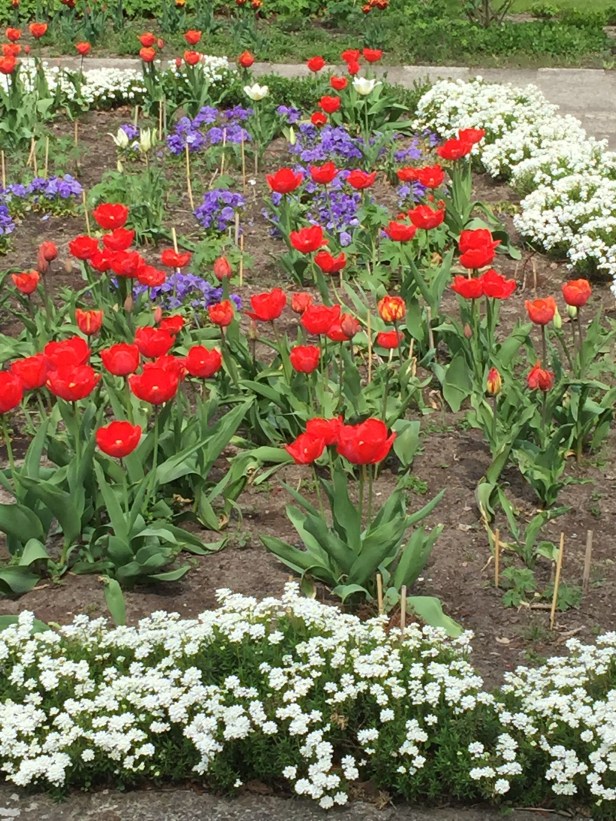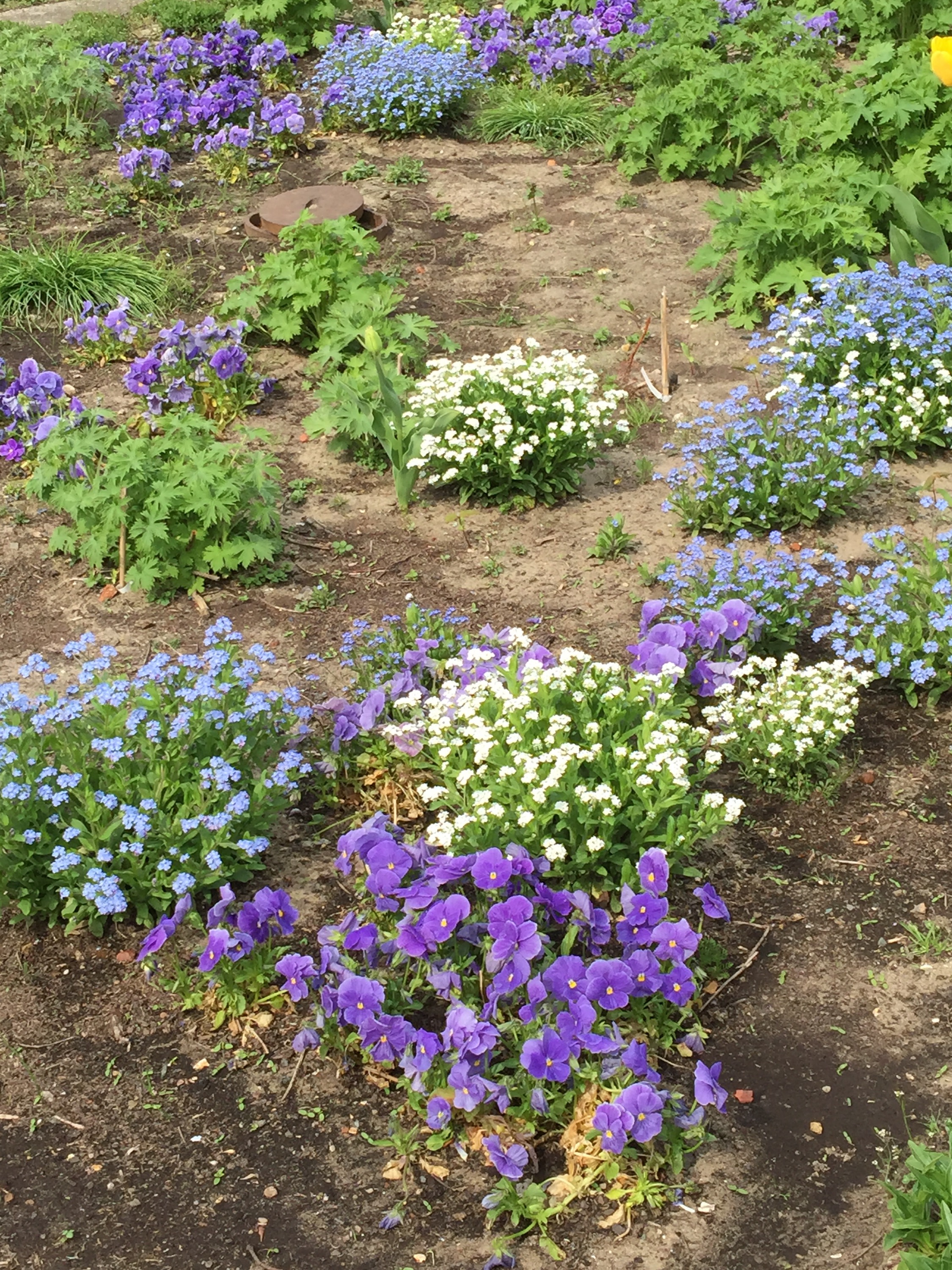 Die Tulpenpracht lädt zum Verweilen ein und verkürzt mit Vergissmeinnicht und Stiefmütterchen die Wartezeit in den Staudenbeeten. Im nächsten Bild sieht man die Kombination in einem Beet mit Rittersporn.