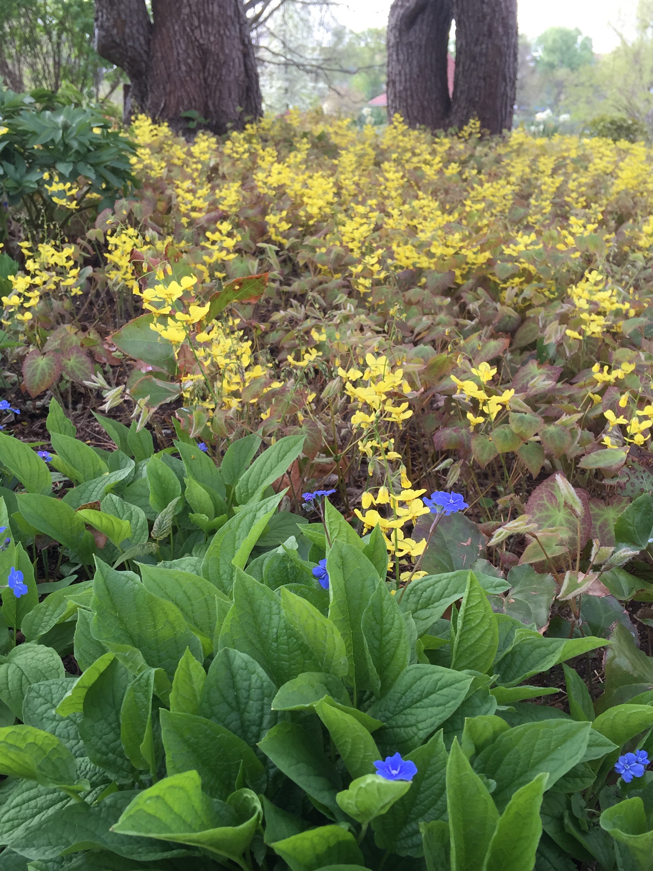 Auch das wunderbare gelbe Epimedium/ Elfenblumenbeet wird durch das blaue Kaukasusvergissmeinnicht umrahmt. Eine tolle Kombination unter Gehölzen im Halbschatten.