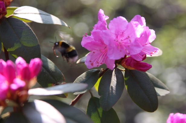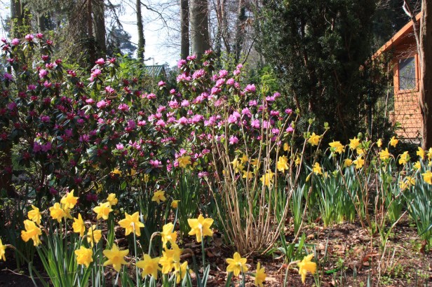 Obwohl es nachts noch Minusgrade sind, kommt Herr Frühling mit Meilenstiefeln anmarschiert. Am Samstag gab es feine Sonne im Brandenburgischen Süden bis hinter den Fläming, so dass es Viele hinaustrieb in den Garten. Holz machen, die letzten Schnitte vor der Fällruhe von März bis Oktober machen, aber auch mit Allem , was Beine hat, spazieren gehen. Wunderbar. Die Zeit des Wartens, aus dem Fensterschauens und der Langeweile, ist für die Gartenenthusiasten vorbei. Wobei es die ganz Begeisterten bei jedem Wetter hinaustreibt. Ist ja bekanntlich nie falsches Wetter, sondern nur falsche Kleidung. Der sehr früh blühende Rhododendron praecoxs schüttelt auch seine schützende Winterhaut ab und steht in den Startlöchern.