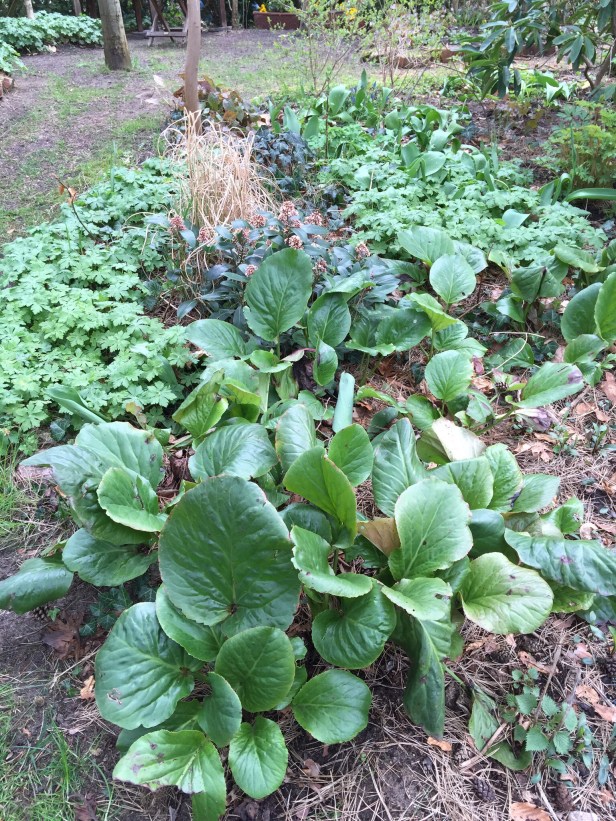Ganz wunderbar sind die immergrünen, manchmal im Herbst rotbraunen Bergenien, auch Elefantenohr genannt. Es gibt sie in verschiedenen Blütenfarben in rosa und Lilatönen.