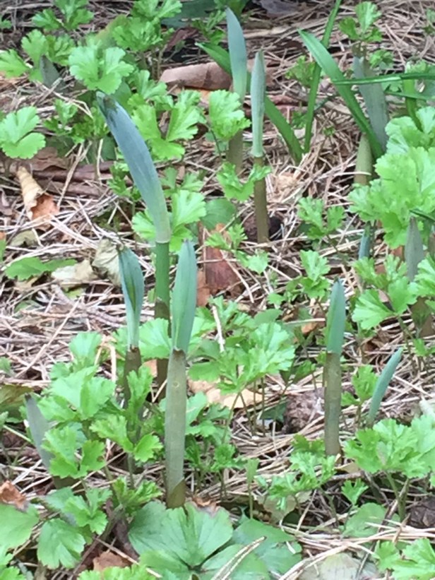 Hier ca. 4 Tage, nachdem im April die ersten Spitzen aus dem Boden lugten. Zusammen mit dem grünen Bodendecker Waldsteinia ternata, der im Mai gelb blüht. Ich habe beide Pflanzen unter hohen Kiefern mit riesigen Kronendächern. Man sieht die Kiefernnadeln. Der Boden hat ein leicht saures Milieu, da ich die Nadeln oft im Beet liegen lasse, sie überwuchert werden und allmählich verrotten.