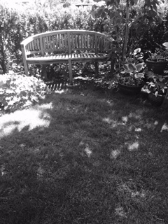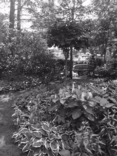 An der einen Aussenecke des Gartens bot sich vor 5 Jahren eine schöne Gelegenheit , ein Eibenhalbrund um eine halbrunde schöne Gartenbank anzulegen, von der ich diagonal durch den Garten sehen kann. Und auch wieder Hosta und Storchschnabel. Beide halten die Rasenkante schön, so dass ich keine Rasenkanten steche.