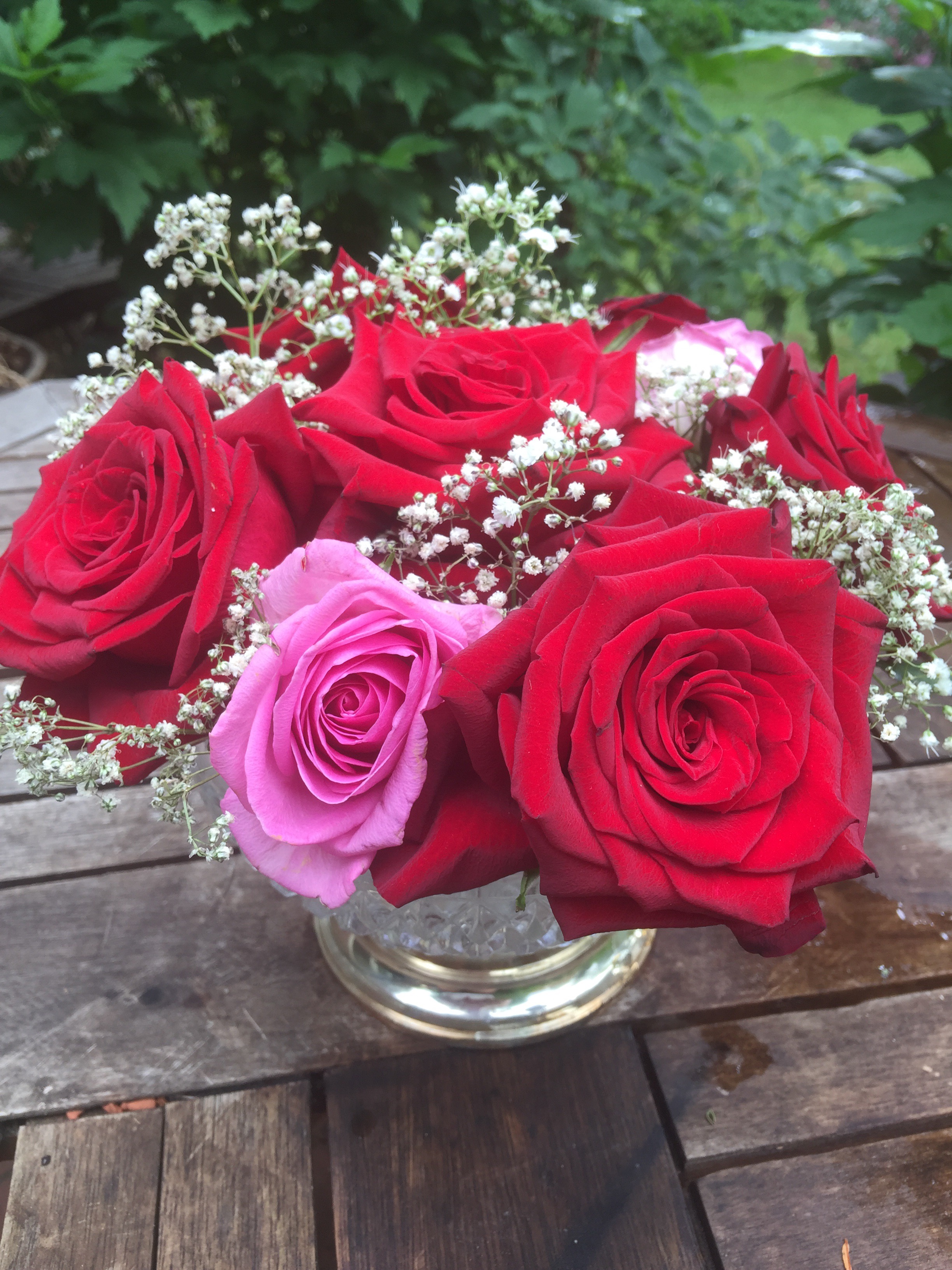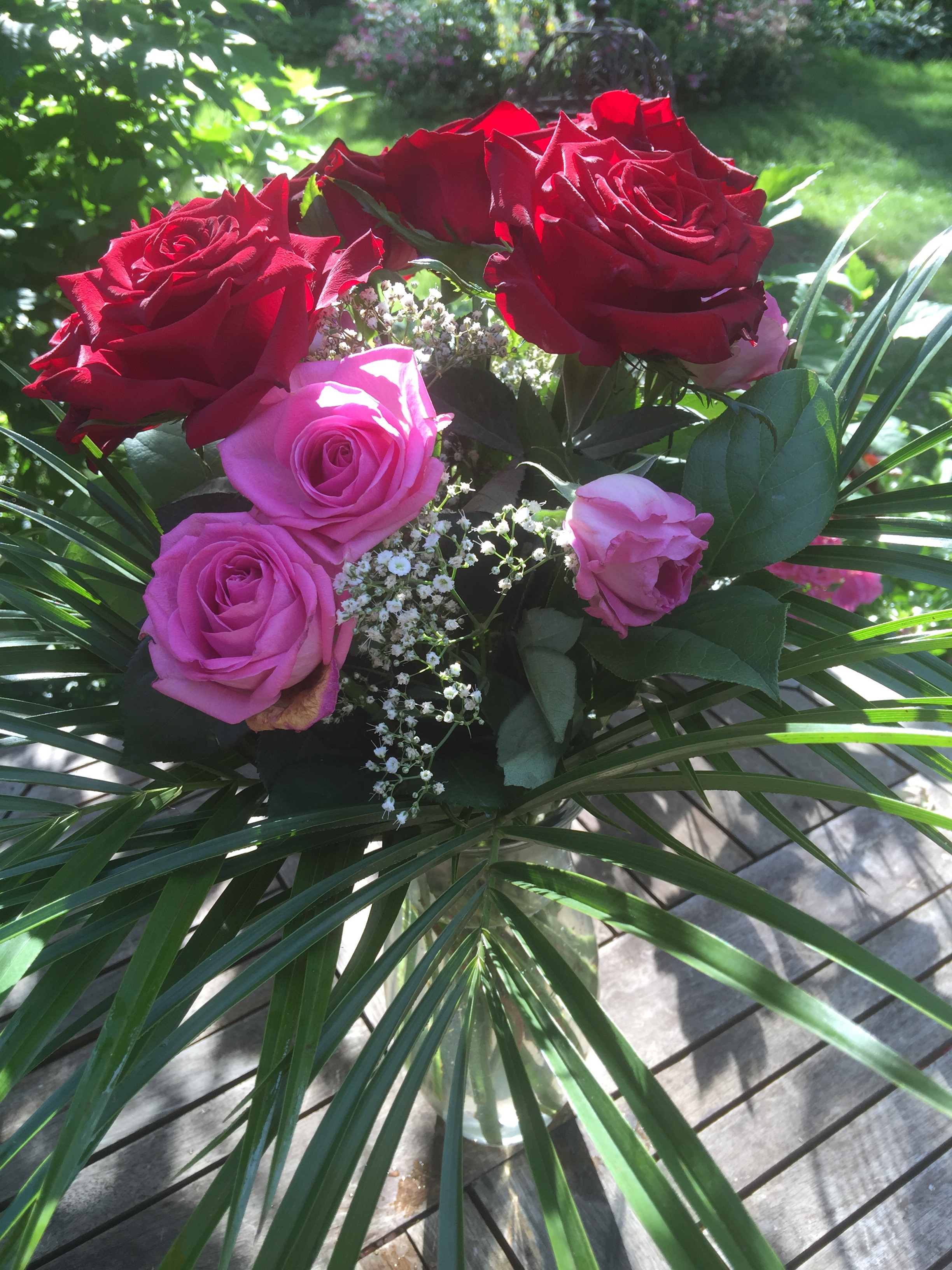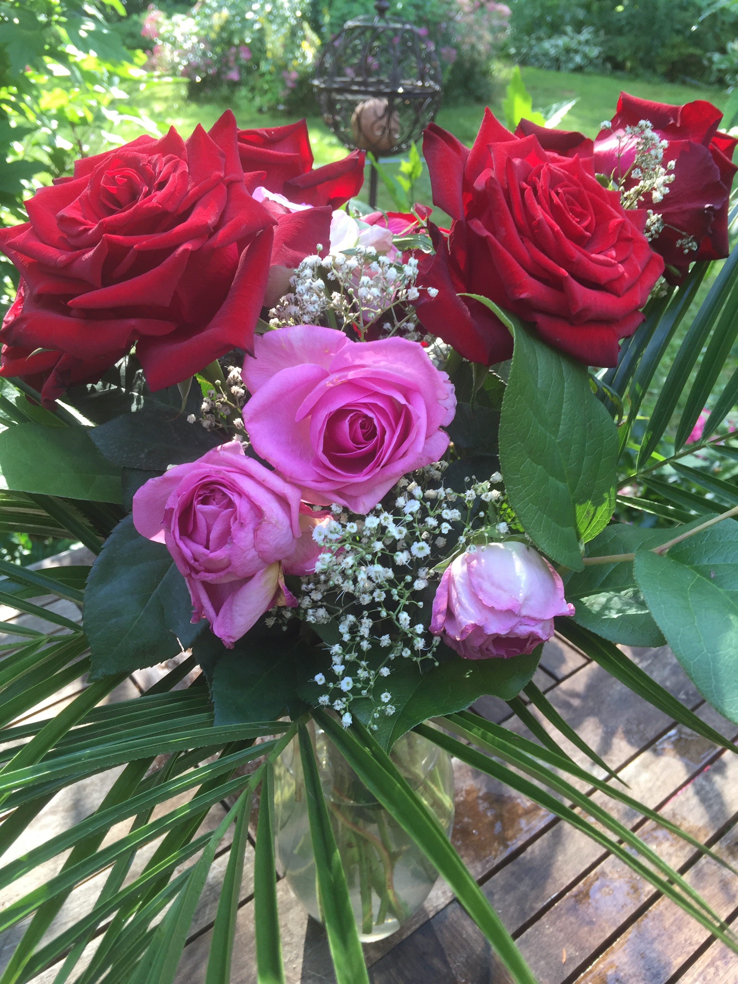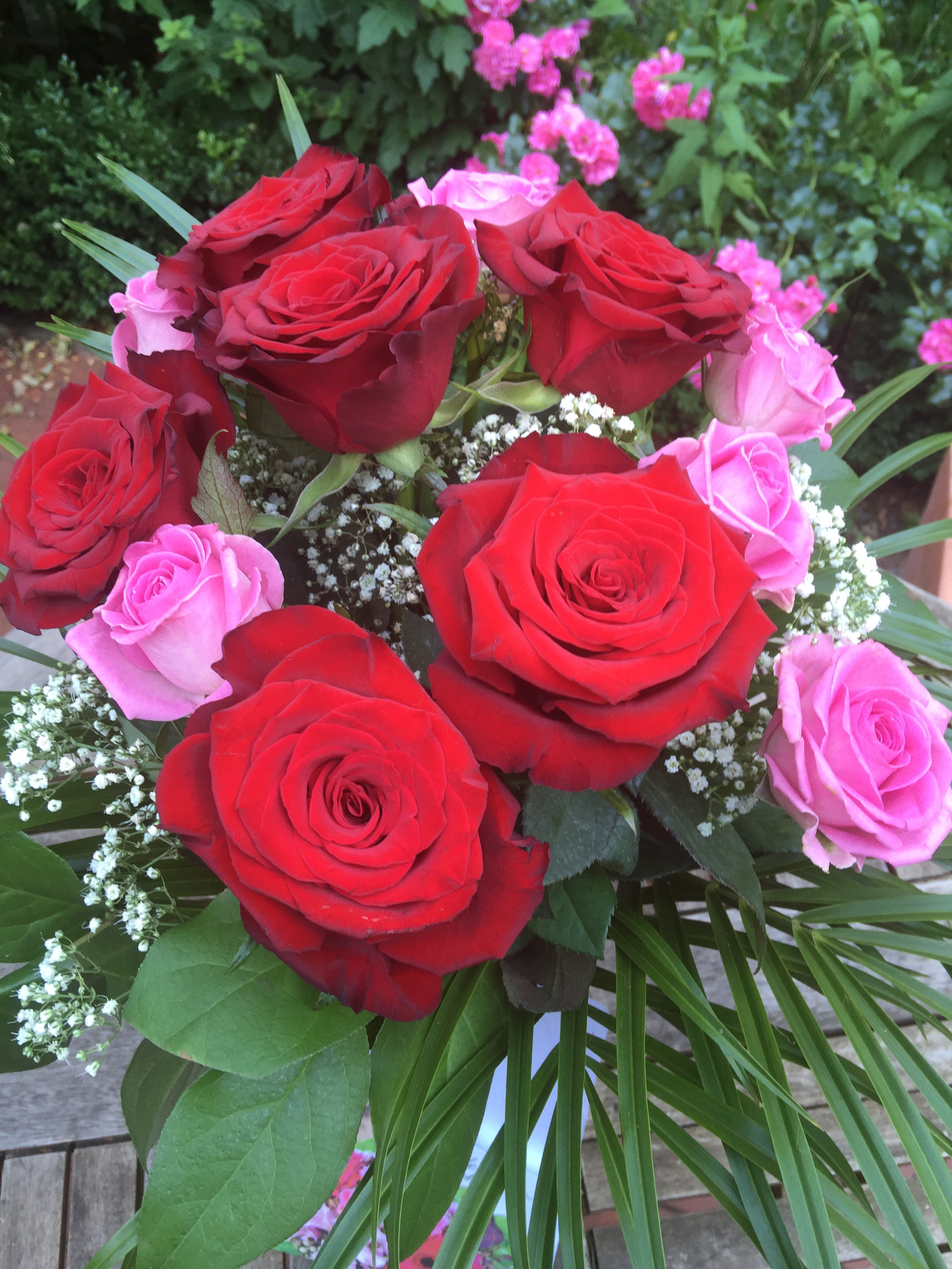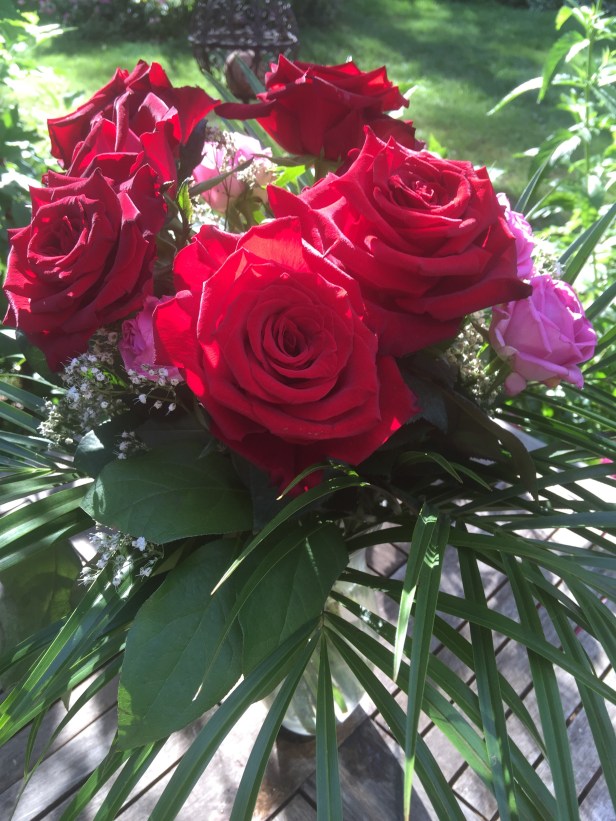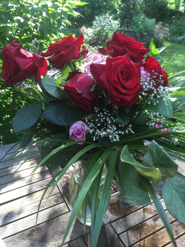 Wie viele Gartenbesitzer schmerzt es mich, die sorgsam gepflegten Gewächse ihrer Blüten zu berauben und sie der schnellen Vergänglichkeit einer Vase zu überlassen. Also Klartext: Ich schneide meine Blüten nicht für Sträusse ab. Ich freue mich über den Gartenblick. Und wir beschenken uns mit einem schönen Kauf-Strauss. Am Dienstag , zum Geburtstag meines Sohnes sollten es Rosen sein, die Königin der Blumen.