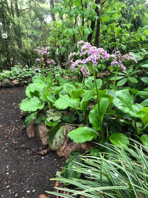 Die sonst schon verblühten Bergenien/Elefantenohr stehen noch in vollem Flor.
