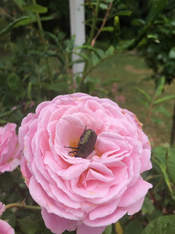 Heute habe ich beim Rosenschnitt der abgeblühten Triebe das erste Mal einen wunderschönen Rosenkäfer entdeckt. Cetonia aurata ist sein lateinischer Name. Er gehört zu den schönsten Käferarten im heimischen Garten. Er gehört zu den stark gefährdeten und unter Naturschutz stehenden Käfern aus der Gruppe der Blatthornkäfer. Seine Engerlinge sind nützlich im Kompost und er braucht Wärme. Insofern sind die wärmeren letzten Jahre vielleicht die Ursache für sein Erscheinen.