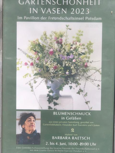 Heute beginnt mit einem kleinen Festakt der Freunde und Förderer der Freundschaftsinsel mit Jörg Näthe im Pavillion der Brandenburger Kunstvereins auf der Insel die Ausstellung ‚Blumenschmuck in Gefässen’ . Die vergänglichen Blumenschätze aus Potsdamer-und Umlandgärten kann man kunstvoll arrangiert bis Sonntag 19 Uhr auf der Freundschaftsinsel ansehen.