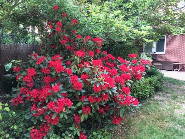 Dieses Jahr ist bei allen benachbarten Waldgartenfreunden mit Rhododendren der geringere Blütenflor , dafür aber kräftigen Neutrieben aufgefallen. Der Rote ist zwar vollbesetzt mit Blüten. Diese fallen kleiner aus dieses Jahr, trotz Düngung, saurem Boden und genug Feuchtigkeit.